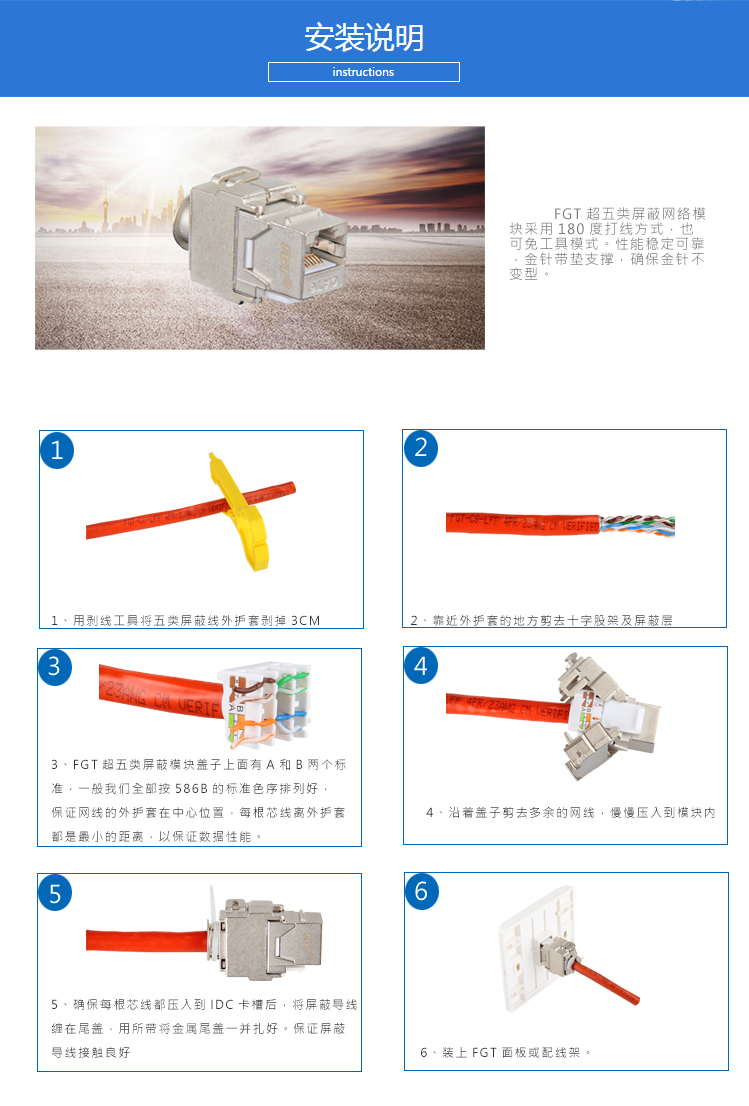 FGT超六類屏蔽模塊采用無鏠屏蔽技術(shù),更易于安裝施工,該模塊可無需專用工具,即可完成端接工作。